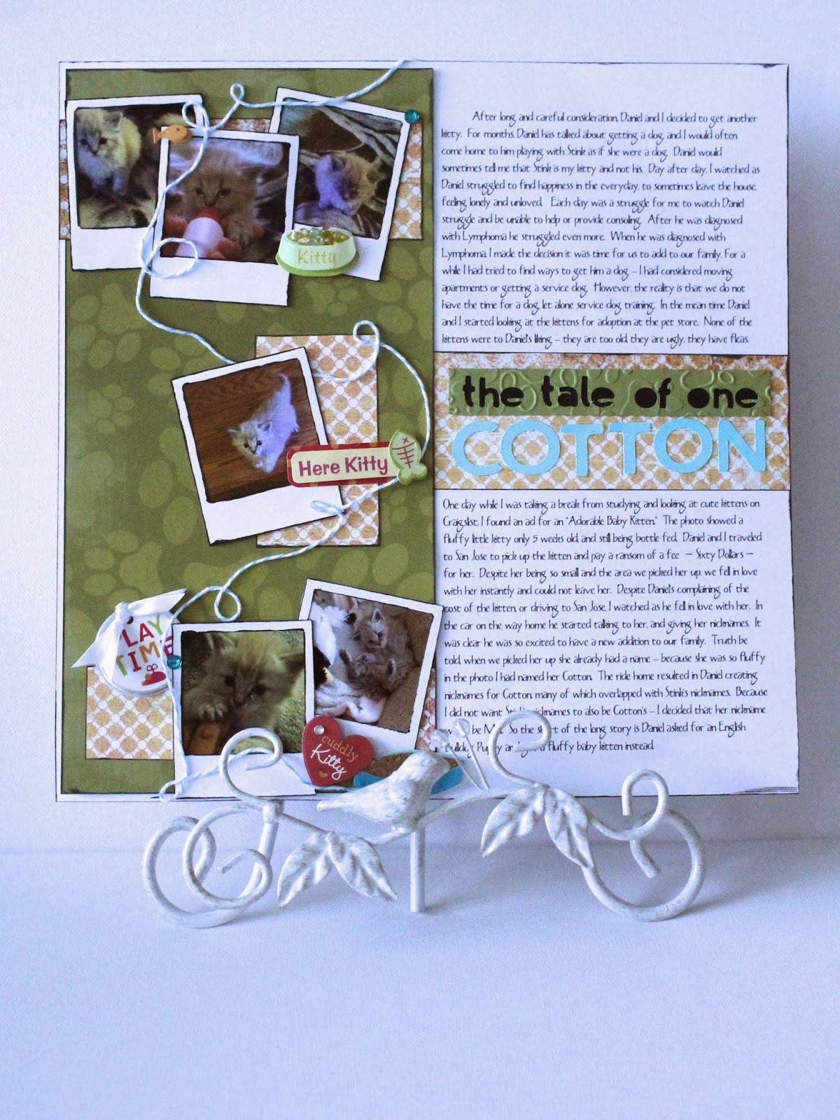 This layout is a more traditional take and interpretation of the idea that Karen shared on PRT. One side 6x12 side is text and the other is the layout. I had wanted to use many photos of the new kitten my husband and I recently got. This story is very related to the story in the first layout - I wanted to document the reason why we got a new kitten and how we got the kitten, the story of adding to our family.